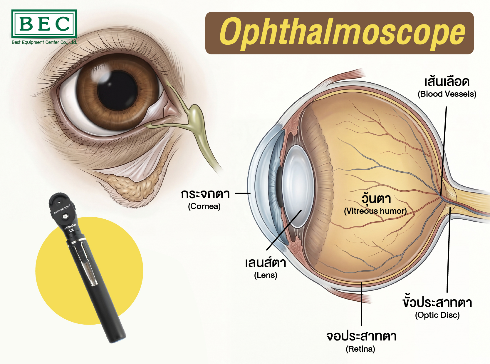 ตรวจเส้นเลือดในจอตา (Blood Vessels) - สามารถประเมินภาวะความดันโลหิตสูง เบาหวาน หรือโรคทางเลือด