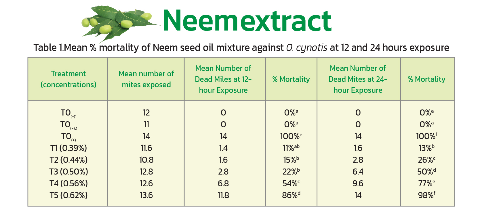 Kusin, A. A., Bagot, M. A., & Lumain, J. (2016). In vitro acaricidal efficacy of neem (Azadirachta indica) oil against ear mites (Otodectes cynotis). Journal of Agricultureand Technology Development.