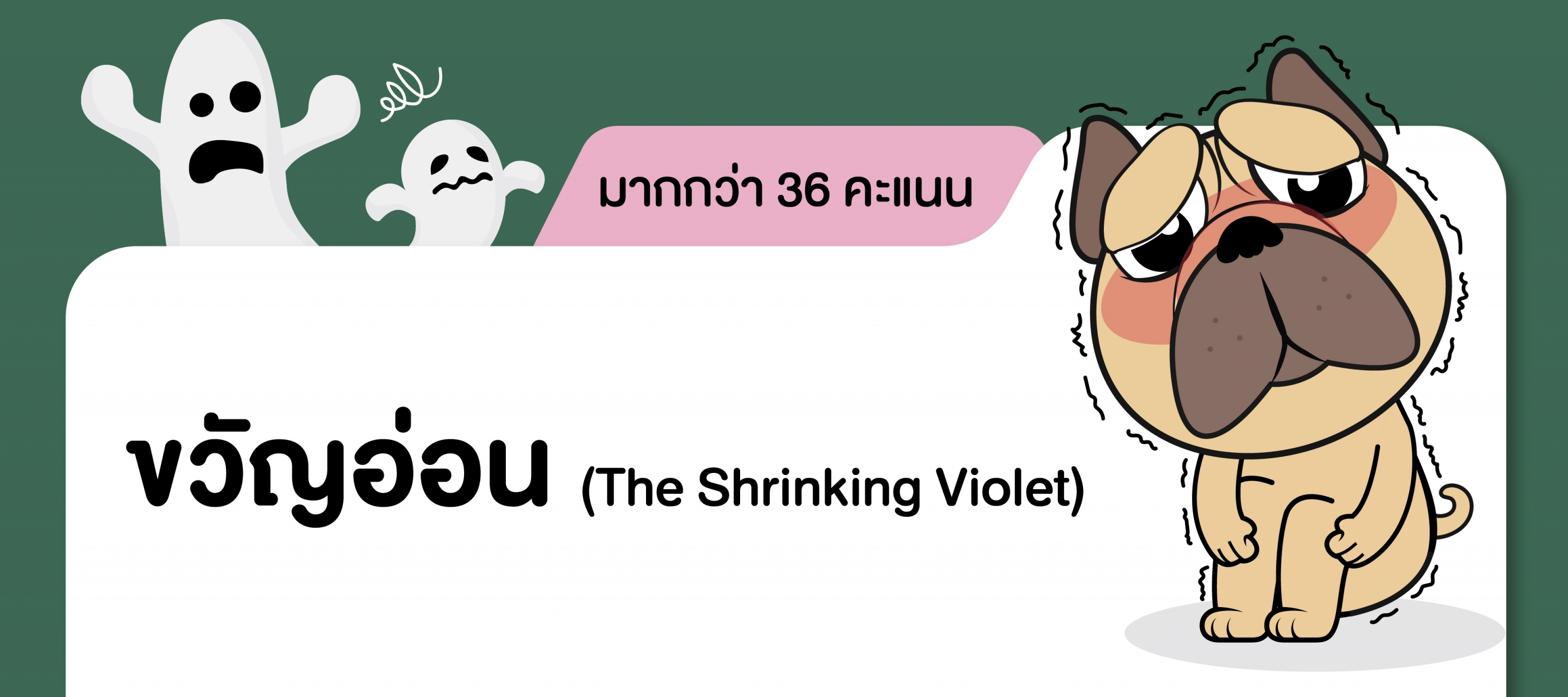 ขวัญอ่อน (The Shrinking Violet) (มากกว่า 36 คะแนน) สุนัขที่มีบุคลิกขวัญอ่อน ขี้อายมักจะวิตกกังวลหรือไม่แน่ใจ พบเห็นได้ทั่วไปในสายพันธ์ุ Italian Greyhound, Cavalier King Charles Spaniel, Bichon Frise, Shih Tzu, Basenji, และ Whippet สุนัขเหล่านี้อาจ 'ตกใจ' เมื่อได้ยินเสียงกระทันหัน และต้องการเจ้าของที่สามารถสร้างความมั่นใจด้วย การเสริมกำลังเชิงบวกให้พวกเขาได้ พวกเขาอาจไม่คิดว่าพวกเขาชอบเล่น ดังนั้นของเล่นตุ๊กตาเนื้อนุ่ม ที่มีเสียงแหลมจึงเป็นวิธีที่ดีในการทำให้พวกเขามีส่วนร่วม ควรใช้วิธีการฝึกแบบเสริมแรงเชิงบวก เช่น การสั่งให้ปฏิบัติและให้ขนม ให้รางวัลกับพฤติกรรมที่กล้าหาญและการขัดเกลาทางสังคมที่เหมาะสม สามารถช่วยให้พวกเขาเอาชนะความ เขินอายได้ การได้ออกไปสัมผัสกับสภาพแวดล้อมและประสบกา รณ์ใหม่ๆ อย่างค่อยเป็นค่อยไปเป็นสิ่งสำคัญสำหรับการเข้าสังคมของเขาเหล่านี้
