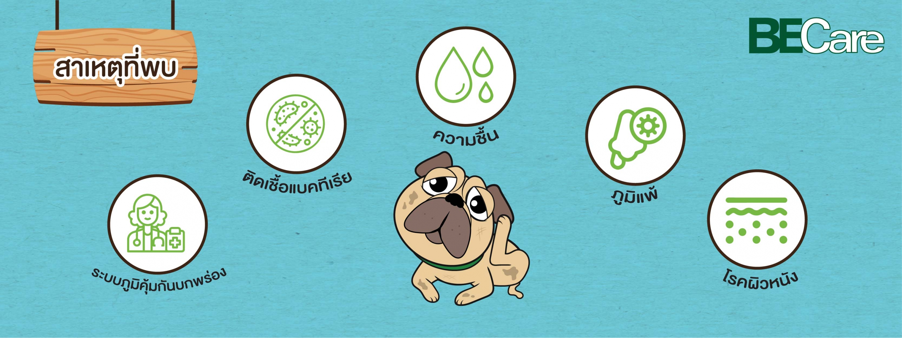 1. สาเหตุ: การเจริญเติบโตมากเกินไปของเชื้อรา Malassezia จากความชื้น, ภูมิแพ้, การติดเชื้อแบคทีเรีย, ระบบภูมิคุ้มกันบกพร่อง หรือโรคผิวหนัง