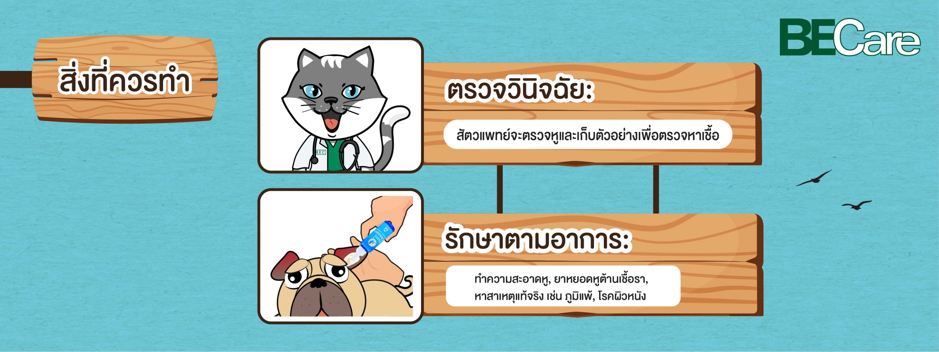 5. การป้องกัน: ป้องกันได้โดยการทำความสะอาดหูสุนัขเป็นประจำให้ “แห้งและสะอาด” อยู่เสมออย่างน้อยสองอาทิตย์ครั้ง, รักษาโรคผิวหนังและภูมิแพ้ให้ดี, เช็ดหูสุนัขหลังเปียกน้ำทุกครั้ง และหลีกเลี่ยงอาหารที่เป็นสาเหตุของภูมิแพ้